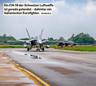 ISTRANAGleich sechs der 30 Schweizer F/A-18 sind für drei Wochen auf dem norditalienischen Luftwaffenstützpunkt Istrana und üben Luftkämpfe mit italienischen und amerikanischen Maschinen. Auch der Kampf eins gegen eins im sogenannten Dogfight kann dort geübt werden. Im Trainingsgebiet über der Adria dürfen die Piloten mit ihren Jets bis auf 100 Meter runtergehen, um so ihre Maschine in eine vorteilhafte Position zu manövrieren. Ein Highlight, wie die Piloten dem 20 Minuten-Reporter vor Ort erzählen: Sie kämpfen auch gegen ihren künftigen Jet, den F-35 der italienischen Armee. Die Piloten zeigen sich begeistert – obwohl sie mit der F/A-18 viele Kämpfe gegen den neuen Jet verlieren. Es zeige sich, wie überlegen der neue Flieger sei, und das löse «Vorfreude auf den neuen Arbeitsplatz aus», so Luftwaffenchef Peter Merz. SLA