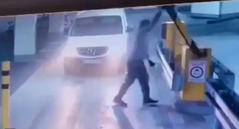 Schranke von einem der Täter, bekleidet mit einer schwarzen Pufferjacke, manuell von Hand geöffnet.