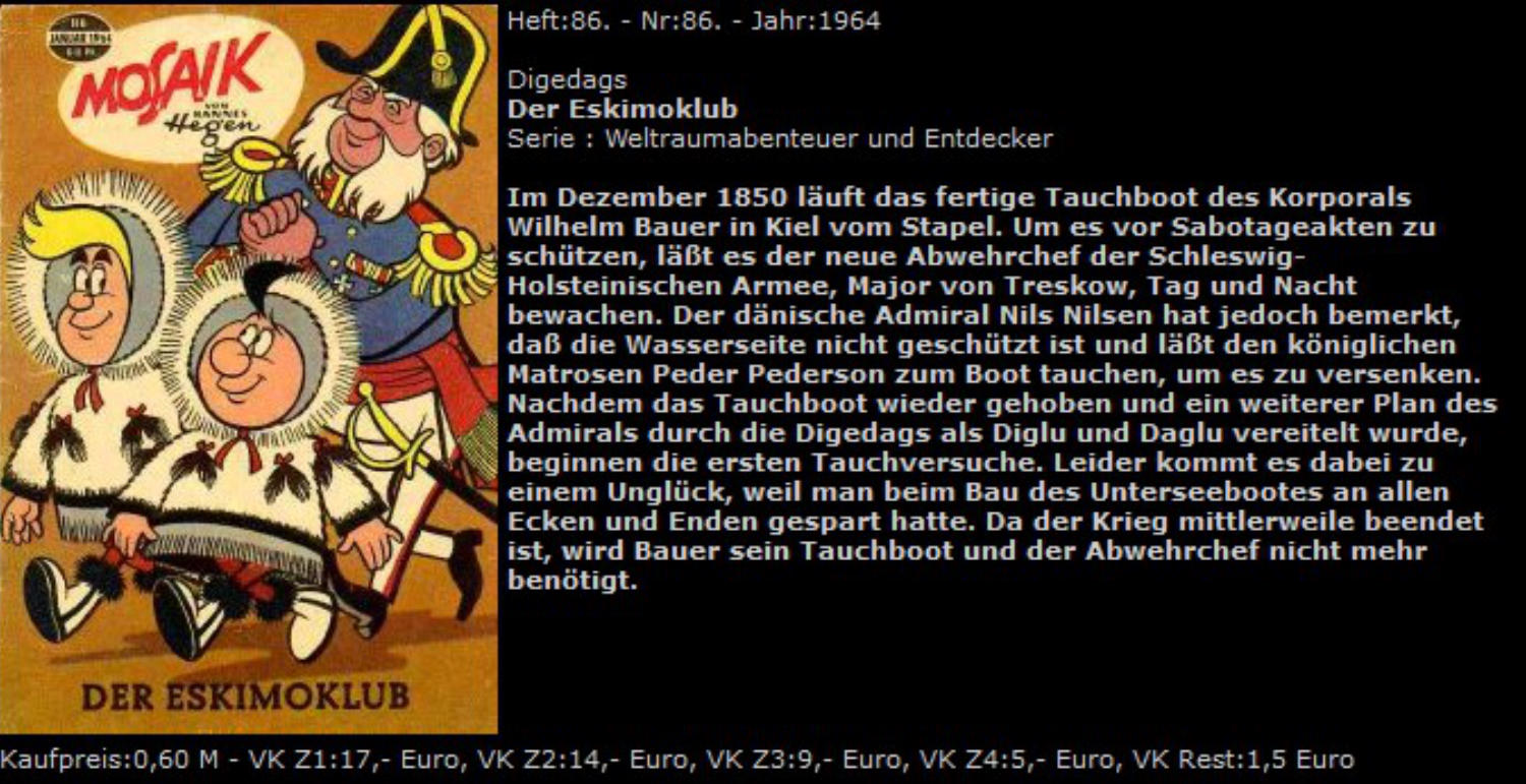 Dig und dag schützen als Eskimos verkleidet das von Wilhelm Bauer konstruierte U-Boot, den "eisernen Seehund". Als sie Bauer nach England begleiten, entdecken sie im Ärmelkanal ein gesunkenes, mit Schätze beladenes Schiff.
